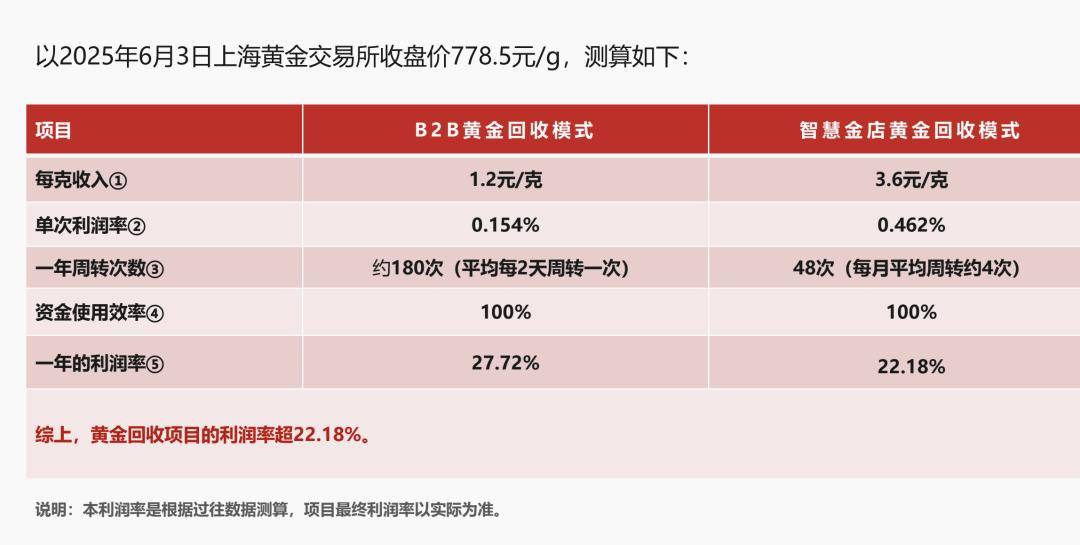 一份内部项目资料对该流程表述更为直接:投资者将资金转入合伙企业指定账户,合伙企业基于与项目公司的黄金回收业务合作,最终将所得收益分配给投资者。该智慧金店黄金回收模式的年利润率高达22.18%,近3个月项目折算的年化收益率为9.79%。